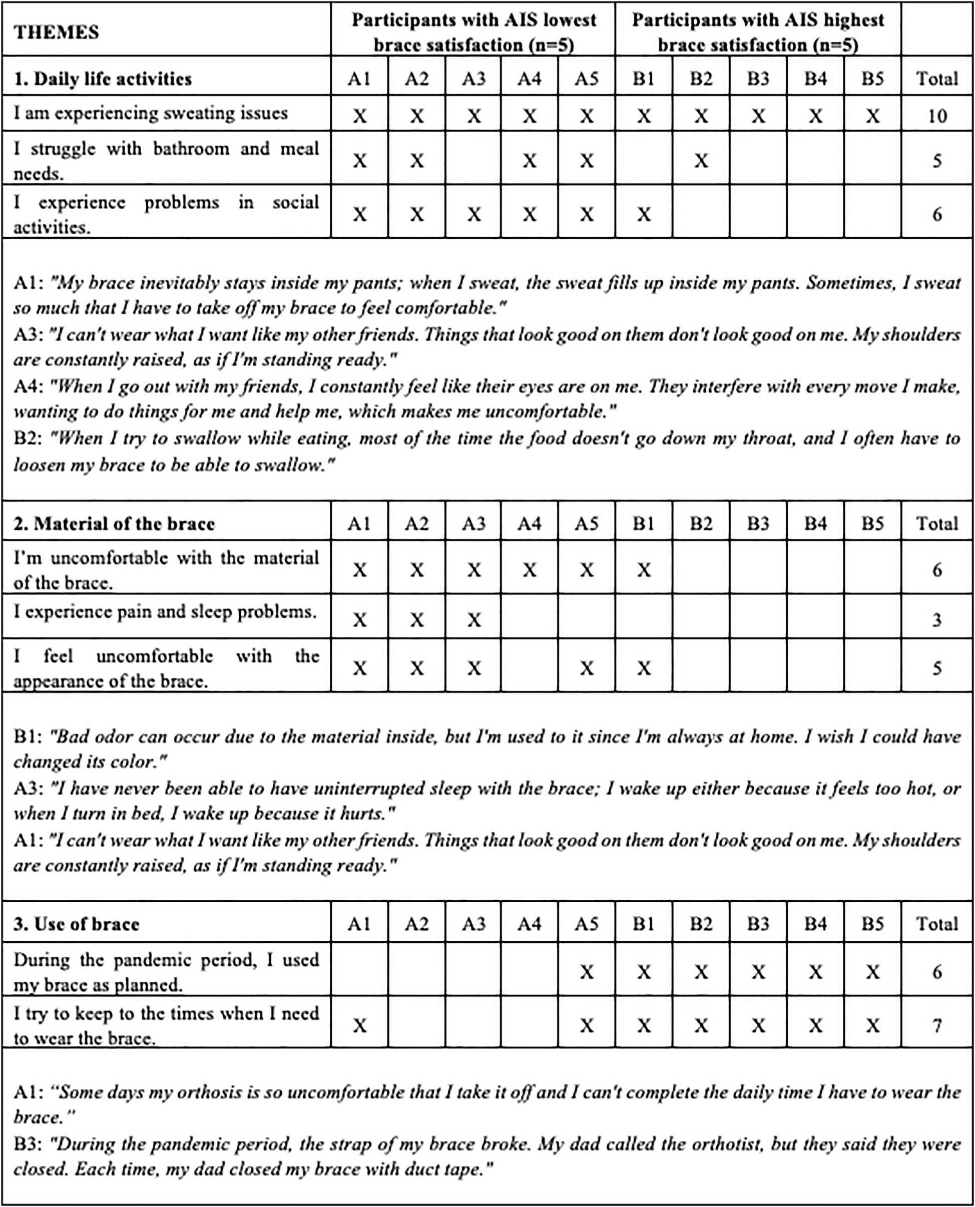 In the qualitative part of the study, the responses to the individual interviews conducted using interview forms were analysed under three themes in order to examine the factors affecting brace satisfaction in individuals with AIS receiving brace treatment. These themes are as follows: opinions related to daily life activities involving orthosis use; opinions about the material of the orthosis; and opinions about the use of orthosis. The results of the semi-structured individual interviews are shown in Figure 3.