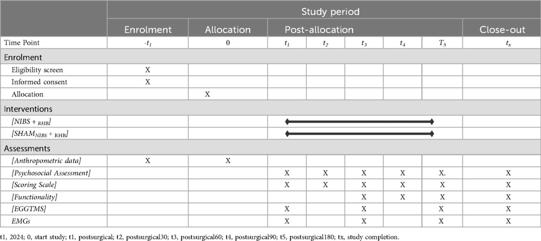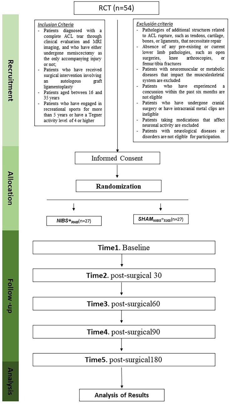 This study will be a randomized controlled trial featuring a double-blind, comparative, and longitudinal approach. To ensure clarity and thoroughness, the study will adhere to the SPIRIT statement guidelines (Table 1) (37). The TIDieR checklist will be used to report outcomes (38). The planned investigation will include a protocol with two comparator arms: NIBS + ProtocolRHB and ShamNIBS + ProtocolRHB, with participants randomly assigned to either arm (Figure 1). Patients will provide written informed consent prior to any study procedure, including randomization. Data collection will be conducted between April 2025 and December 2027. This study was approved by the Ethics Committee of the Catholic University of Valencia (UCV/2023-2024/053). Additionally, the study was pre-registered at https://www.Clinicaltrial.gov on 01/01/2025 (NCT06818201).