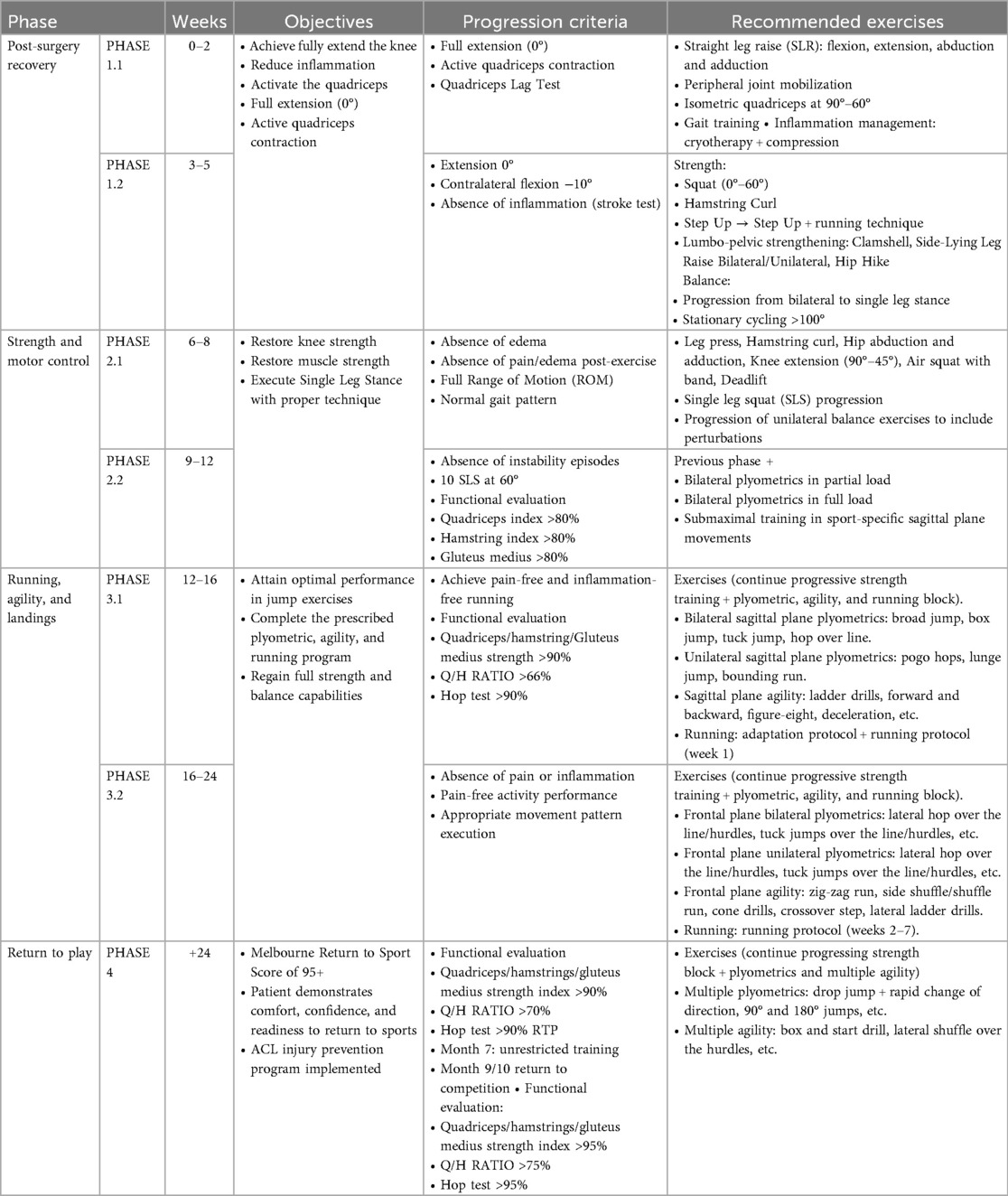 A specialized rehabilitation protocol for postsurgical ACL recovery will be implemented. This protocol, grounded in the latest clinical guidelines (43–45), will be structured into four distinct phases: i) post-surgical recovery (weeks 0–5); ii) strength and neuromuscular control (weeks 6–12); iii) running, agility, and landings (weeks 13–24); and iv) return to sport activity (after week 24). The program will encompass 72 sessions scheduled three times a week over a 24-week period. Strength training will be the primary focus of all phases. To ensure optimal patient progress, regular assessments will be conducted with advancement to subsequent recovery phases based on the specific criteria. A schematic representation of the exercise protocol will be employed during rehabilitation (Table 2).