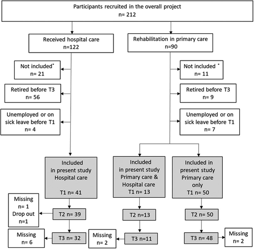 Participants who were hospitalised had a mean hospital stay of 37 days (±40) and were included in the study at the end of the hospital stay. Participants in the PC group were included when they contacted the local primary care rehabilitation clinic because of remaining rehabilitation needs, resulting in a variation in time from onset to first assessment (Table 1).