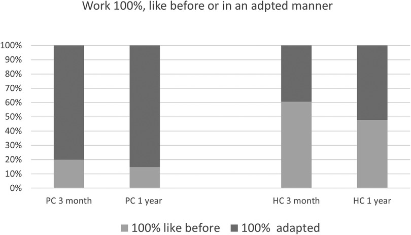 Figure 3. Percentages of participants in the PC and HC groups who worked 100%, either like before COVID or in an adapted manner, at 3 months and 1 year.