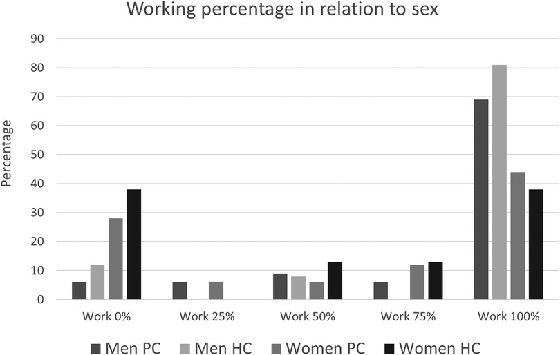 To explore the RTW in relation to gender and age groups (±40 years) the different levels of return to work in the PC and HC groups from this perspective could be seen in Table 2. The HC group was older than the PC why the number of men in HC < 40 years was only 3 and therefore not valid to compare with the other groups in regard to RTW. In most of the groups in Table 2 there were high percentages that had returned to work 100% but with the need of adaptations at 1 year follow-up except for the women in the HC that tended to have less participants in adapted 100% work but more not in work at all compared to the PC group However, the percentage of women who do not RTW one year after being diagnosed with persistent covid is higher than that of men, regardless of whether they come from primary care (28.1%) or hospital (37.5%). The differences between men and women are significant, with women being 3.5 times more likely than men to remain unable to work one year after being diagnosed with persistent covid [Odds ratio 3.482 (CI 1.151–10.534); z = 2.209; p = 0.0272]. Women showed significantly lower proportions of working 100% as before and also the proportions not at all back in work were higher in women (ꭕ2 = 13.67 (p = 0.01). Being male makes it 12 times more likely to return to work as before the covid-19 pandemic than a female [Odds ratio 12.000 (CI 2.538–56.718); z = 3.136; p = 0.0017]. Of the women working full-time, only one, in the HC group, worked full-time without adjustments. By comparison, 15 men in both groups worked full-time without adjustments (Table 2 and Figure 4).