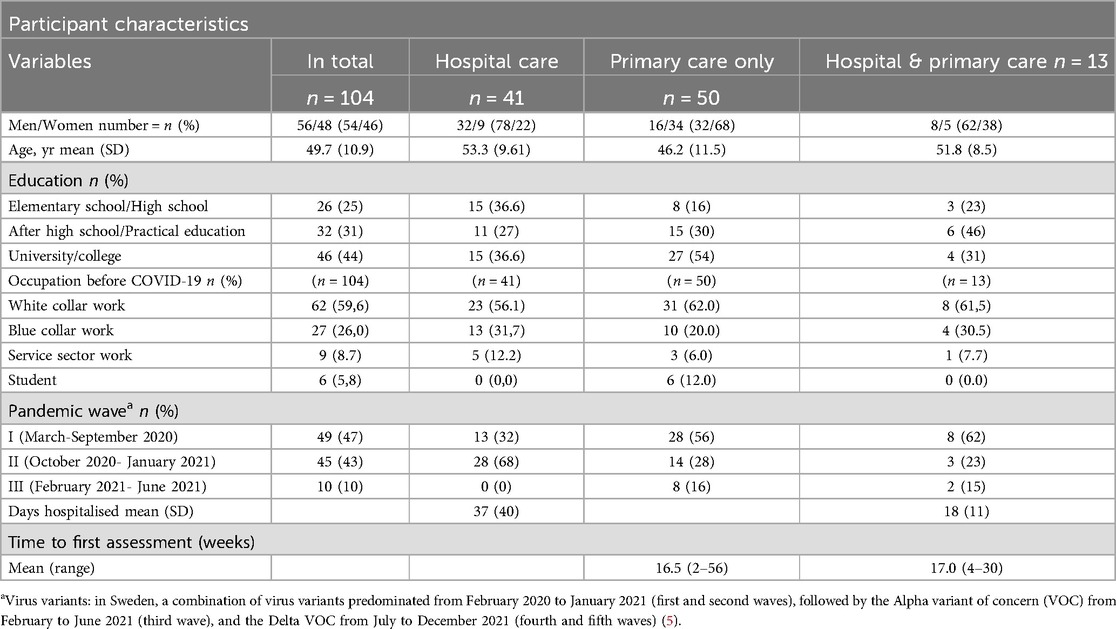 Demographic factors analysed in the three groups (i.e., the HC, PC and PC+ groups) included age, sex, level of education, occupation (work or education), date of COVID-19 onset, pandemic wave, days hospitalised in the HC group, and weeks to first assessment in the PC group. Occupations were divided into three domains: white collar work (office and theoretical work), blue collar work (carpenters, practical work etc), and work in the service sector (bus driver, shop assistant). Level of education was based on those existing in the Swedish school system; 9-year compulsory school, 3-year upper secondary school or higher education such as university education. For the present study regarding the RTW we included participants that had been in higher education, which we equated with being able to return to work. The dates for different pandemic waves were in Sweden, a combination of virus variants predominated from February 2020 to January 2021 (first and second waves), followed by the Alpha variant of concern (VOC) from February to June 2021 (third wave), and the Delta VOC from July to December 2021 (fourth and fifth waves) (5).