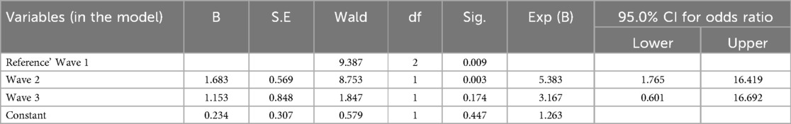 Logistic regression analysis was also performed to assess the impact of COVID-19 onset in different waves (I-III) on RTW. This analysis, using subjects diagnosed during wave one as a reference category, found that RTW differed significantly in subjects diagnosed during wave two, with the latter 5 times more likely to RTW (OR of 5.38). The likelihood of RTW did not differ significantly in subjects diagnosed during waves 1 and 3. This model explained between 10.9% (Cox and Snell R square) and 15.7% (Nagelkerke R Square) of the variance in RTW and correctly classified 71.7% of the study subjects (Table 5).