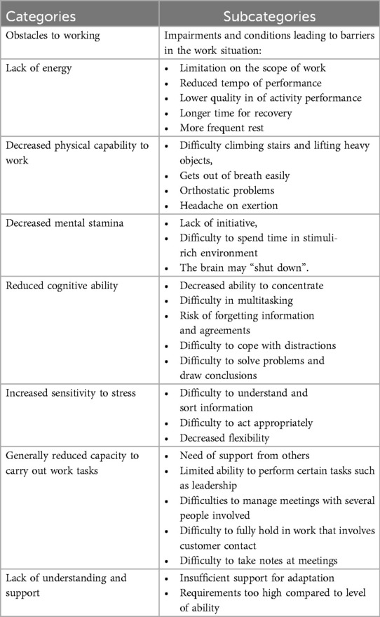 Table 6. Categories and subcategories from the content analysis regarding obstacles to working and the consequences leading to barriers in the work situation.