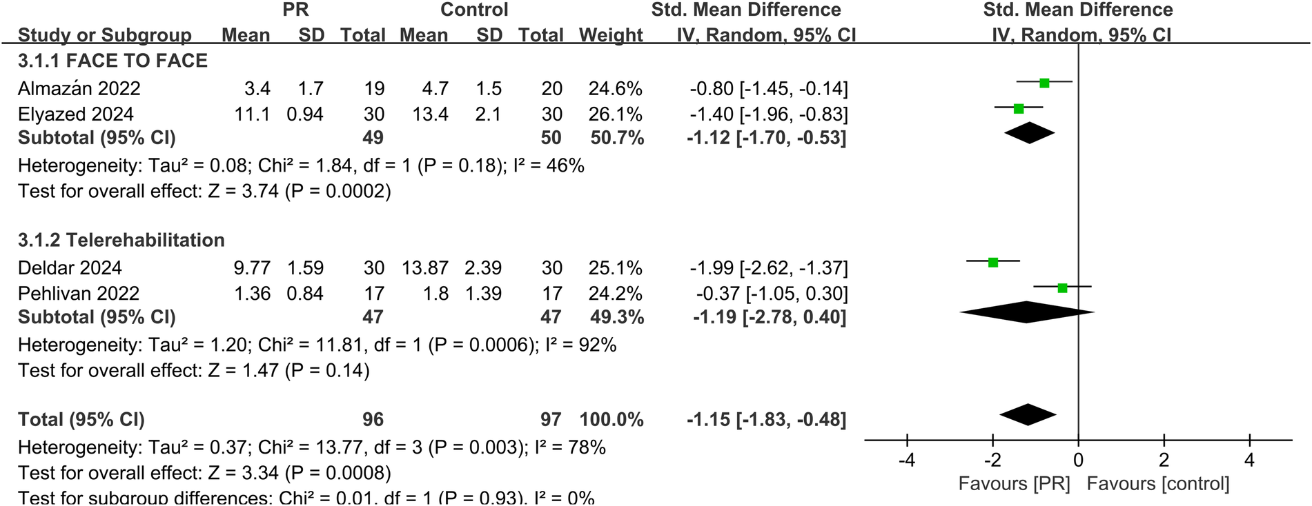 The primary outcome was exercise capacity, assessed by the 6MWD. Secondary outcomes included dyspnea measured using the mMRC scale, fatigue assessed through standardized fatigue-related scales, health-related quality of life evaluated via instruments such as EQ-5D or SF-36, and pulmonary function measured by MIP. Meta-analyses were conducted using Review Manager (RevMan) version 5.4. Continuous outcomes were pooled using either mean difference (MD) or standardized mean difference (SMD) with 95% confidence intervals (CI). Heterogeneity was assessed using the I2 statistic. Values of I2 greater than 50% were considered indicative of substantial heterogeneity, in which case a random-effects model was used. Pre-specified subgroup analyses were performed to compare the effects of telerehabilitation and face-to-face PR. A p-value less than 0.05 was considered statistically significant.
