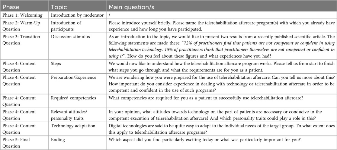 The semi-structured interview guidelines were developed according to the group-dynamic process of focus groups (27) in five phases (see Table 1). First, one moderator welcomed the participants and introduced him/herself, the objectives, the agenda and the discussion rules. An introduction phase with a warm-up question was followed by a transition question with a discussion stimulus [excerpt from a scientific article (28)]. This was followed by the main questions catalog with content-related questions and a final question. The results of a scoping review (20) were embedded as a deductive element of the guideline development. Competencies were thus defined as knowledge areas, skills, attitudes, experiences and personal characteristics required for successful use (20, 29).