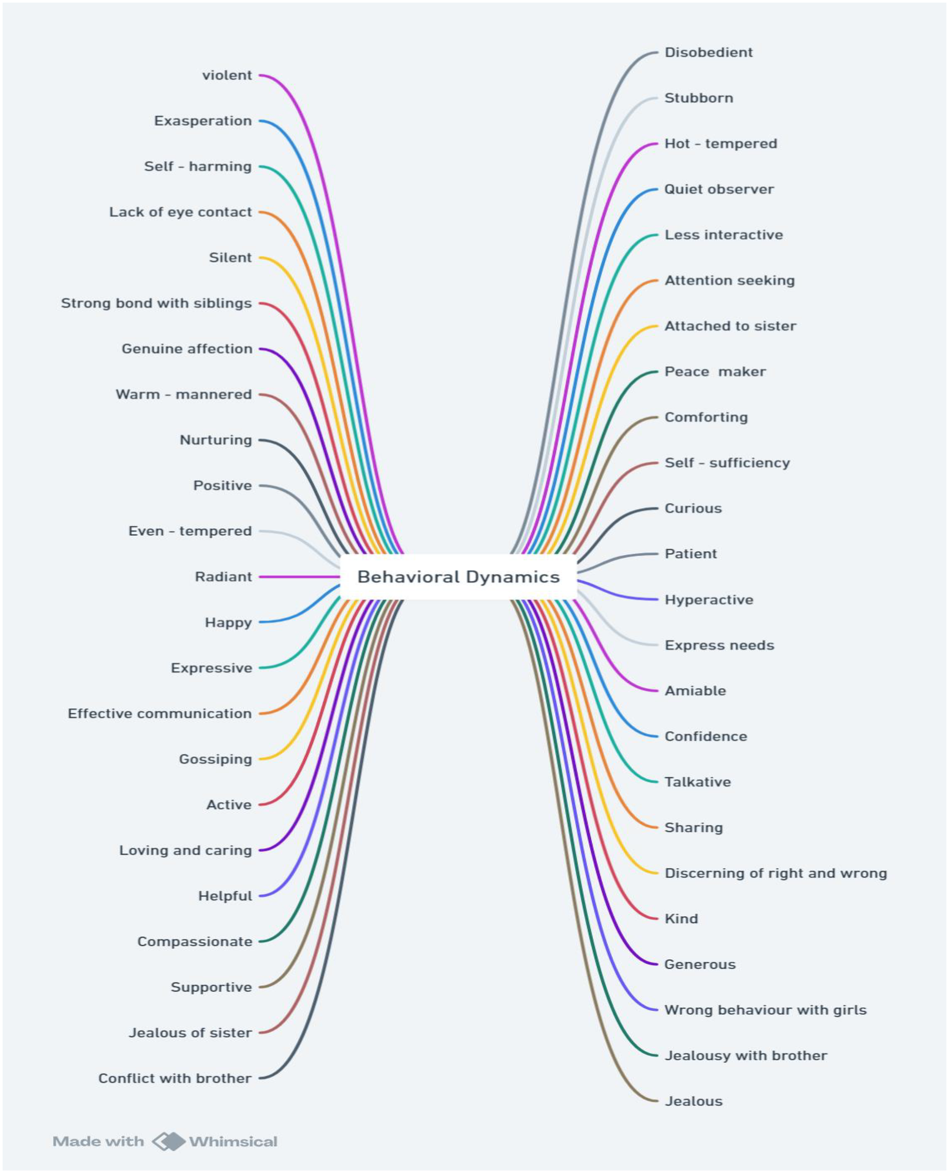 All three objectives of the study were fulfilled. Thematic analysis helped in the formation of initial, developed and final thematic map. The initial map has 47 codes which were placed under nine themes in developed map. Final map has categorized nine themes according to the transcribed data. According to the study, these were shaped by nine broad themes. These are introversion, communication factor, aggression, attachment behavior, emotional awareness, morality, empathy, envy and inappropriate sexual behavior. This sequence is from highest to lowest level of prevalence. Even though it was uncommon, but inappropriate sexual behavior and envy was found to be a problem that needs to be addressed.