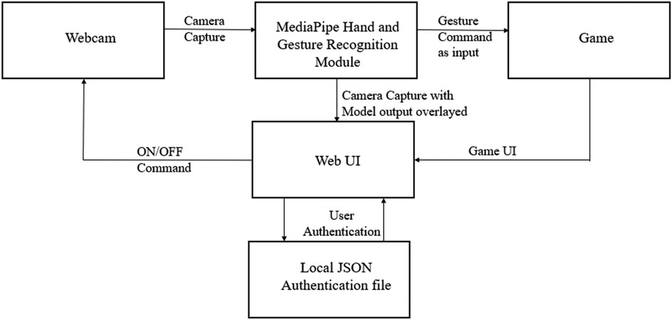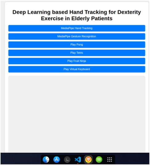 After successful authentication, the user is directed to a page with a dashboard, which provides the user with an interface to the various modules developed, such as hand tracking, gesture recognition, and playing the games developed. After selecting a particular task, the web UI turns on the webcam. The webcam outputs an image, which is fed into the hand-tracking module. In the case of the hand-tracking module, this output is then overlaid on top of the original image captured by the webcam and displayed on the webpage. If the games are selected, the hand-tracking outputs of the hand-tracking module are taken as inputs to the gesture recognition module, which is automatically turned on, and the gestures recognized are fed as input to the games, which provides a personalized gamified experience to the user. The specifics of the gesture recognition module are discussed in the following chapter.