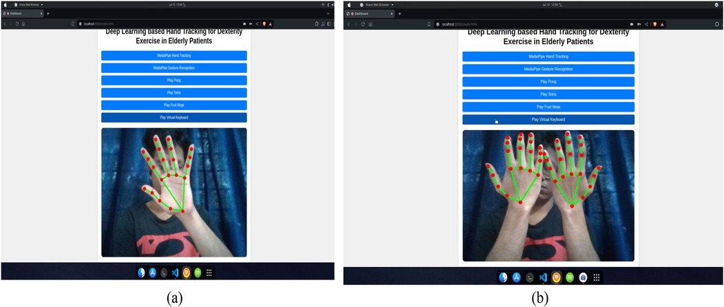 Upon successful authentication, the user is greeted with the page shown in Figure 3. The following Figures 4a,b demonstrate the use of the hand recognition module, which forms the basis for the gesture recognition system and the control for the games. Figure 5 shows the gesture recognition module in action. These figures demonstrate that the gesture is recognized and displayed on the screen for each hand, whether both hands perform the same gesture or different gestures.