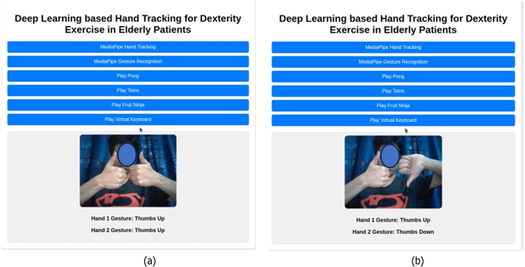 Figure 5. Hand gesture module: (a) showing both the hand thumbs up (b) showing hand 1 as a thumbs up and hand 2 as a thumbs down.