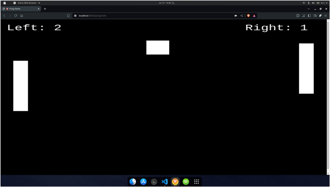 The Pong game, shown in Figure 6, can be selected from the home page after user authentication. It is a simplified recreation of the classic Atari game, where two paddles on either side of the screen move vertically to deflect a bouncing ball. A point is scored when one player fails to intercept the ball, causing it to pass through their side, after which the game resets. The gesture recognition module tracks both hands, labelled as Hand 1 and Hand 2 (Figure 5). A thumbs-up gesture moves the paddle upward, while a thumbs-down gesture moves it downward. The game is designed to improve hand-eye coordination and reaction time. As paddle control is not hand-specific, either hand can be used to control either side. With each level, the ball speed gradually increases, requiring quicker gesture responses and anticipation of the ball's movement, intentionally creating a cognitive and reflex-based challenge.