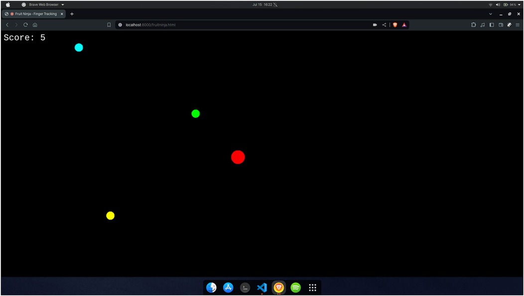 The Fruit Ninja game, illustrated in Figure 8, can be selected from the home page after user authentication. It is a simplified version of the original Fruit Ninja game, adapted for gesture-based interaction. In this version, randomly colored dots rise from the bottom to the top of the screen, and the user controls a red dot representing a virtual blade using the tip of their index finger. Only one hand is tracked during gameplay. When the red dot overlaps with any of the rising dots, that dot is removed from the screen, and the user scores a point. As the game progresses, the speed of the moving dots gradually increases, requiring the user to maintain focus and react quickly. This game is designed to enhance hand-eye coordination and improve reflexes through engaging and dynamic interaction.