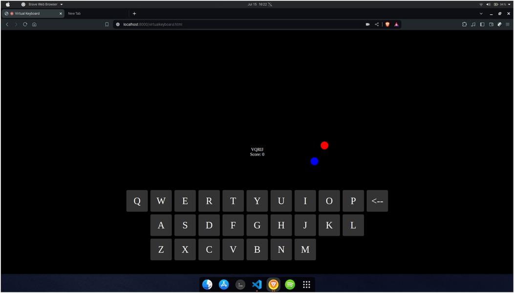 The Virtual Keyboard game, as shown in Figure 9, is one of the games that can be selected as one of the games to be played on the home page after the authentication. This game is meant to exercise hand-eye coordination and mental agility. For this game, only one hand is tracked. The red and blue dots (Figure 9) are meant to denote the location of the index finger and the thumb, respectively. Every six seconds, a new random 5-letter word is generated, and the player must type the word at that time before the next word appears. The typing is accomplished by bringing the index finger and the thumb together like a pinch on top of the desired letter. Therefore, the player must maintain hand-eye coordination and be fast due to the time constraints.