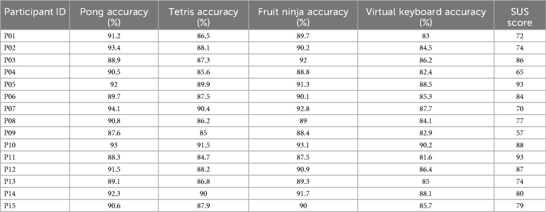 The experimental dataset was collected from fifteen healthy volunteers (aged 18–60 years) after obtaining informed consent, with approval from the institutional ethics committee. Each participant engaged with all four gesture-controlled rehabilitation games (Pong, Tetris, Fruit Ninja, and Virtual Keyboard). For each game, gesture recognition outputs, accuracy scores, and gameplay performance metrics were recorded. In total, the dataset comprised approximately 3,500 gesture instances across participants, with recognition accuracy ranging between 85%–95%. The dataset was created exclusively for proof-of-concept evaluation and is not intended as a large-scale training corpus. Each participant's performance metrics were recorded as shown in Table 1. Gesture accuracy for each participant per game is calculated using Equation 1,