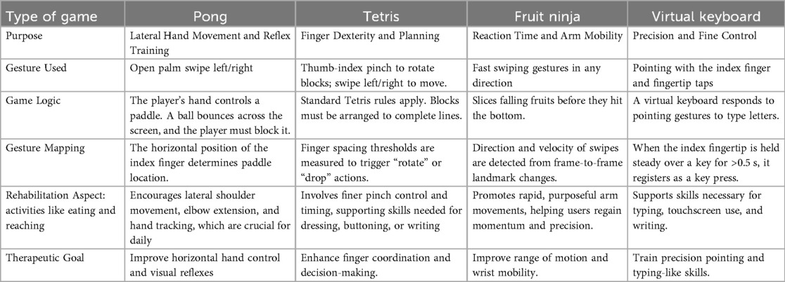 This section discusses the various games developed, the gestures associated with each game, and the functions they should perform. Each game was chosen and designed based on specific therapeutic objectives related to hand function recovery. This system can track various movements, including gross motor skills (like arm sweeps), fine motor skills (such as isolated finger tapping), and cognitive skills (like decision-making and timing).