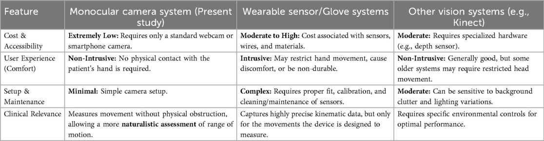 Table 3. Comparative analysis of the proposed monocular camera system vs. alternative low-cost hand rehabilitation tools.
