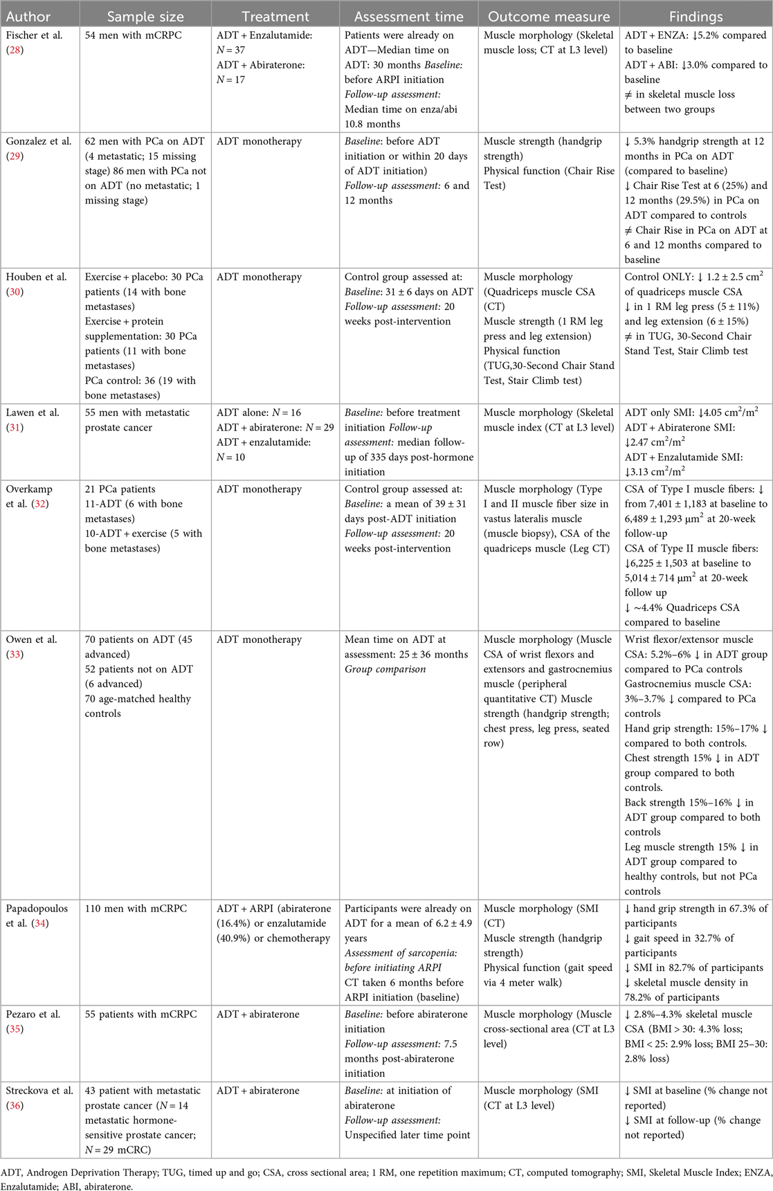 Table 1. A summary of published studies reporting changes in muscle morphology, strength, and physical function in men with prostate cancer receiving ADT only or doublet therapies.
