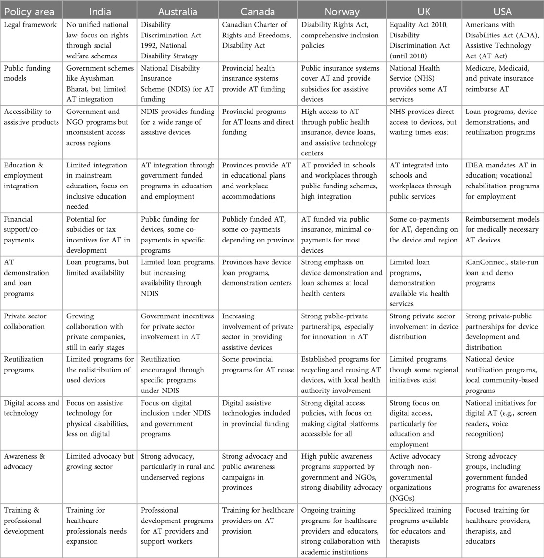 While examples from international contexts such as Australia, Canada, Norway, USA, and UK, were reviewed, the policy recommendations are rooted in India's unique demographic, socio-economic, and health system realities (25–29). These five countries were selected due to the structured availability of public data on AT systems; however, the proposed policy for India has been independently developed to suit its own needs and challenges. The selection criteria included the presence of legal frameworks supporting access to AT, public funding models, accessibility to assistive products, integration of AT into education and employment systems, financial support structures, availability of demonstration and loan programs, collaboration with private sectors, reutilization programs, digital accessibility, public awareness and advocacy initiatives, and professional training and development programs. Information on these national policies and practices was gathered through publicly available sources, including government reports, official websites, international publications, and legal documents. The information was systematically analysed across thematic areas such as legal frameworks, public funding models, accessibility to assistive products, education and employment integration, financial support and co-payment models, assistive technology demonstration and loan programs, private sector collaboration, reutilization programs, digital access and technology, public awareness and advocacy, and training and professional development. The strengths and weaknesses of each program were critically analysed to develop a robust policy proposal for India, and a summary of this analysis is provided in the supplementary information (Table 1) (25–29).
