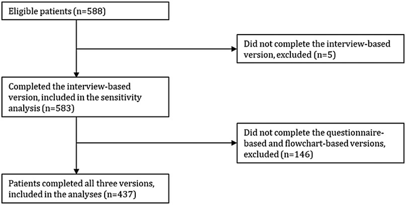During the study period, 588 patients were seen by both a medical doctor at the Long COVID clinic and an occupational therapist. Of these, five patients (0.9%) did not complete the interview-based version and were excluded from the study. A total of 583 patients completed the interview-based version and were included in the sensitivity analysis of the primary hypothesis, and 437 patients (75%) completed all three versions and were included in the final analyses (Figure 1).