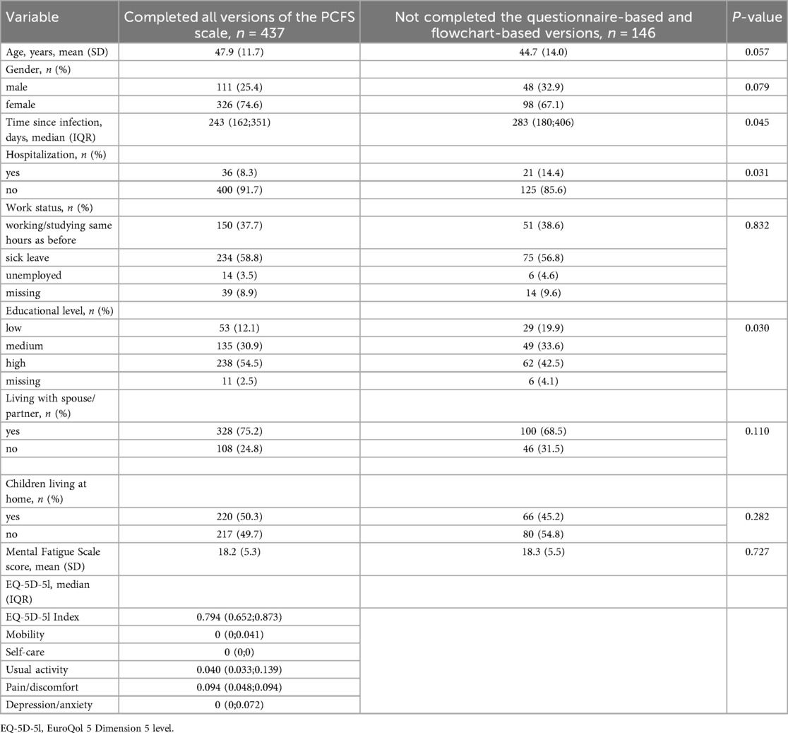 Compared with patients who completed all versions of the PCFS scale, those who did not complete the questionnaire-based and the flowchart-based versions were tested longer after the acute infection, had a lower educational level and a larger proportion had been hospitalized. These patients did not complete the EQ-5D-5l either (Table 1).