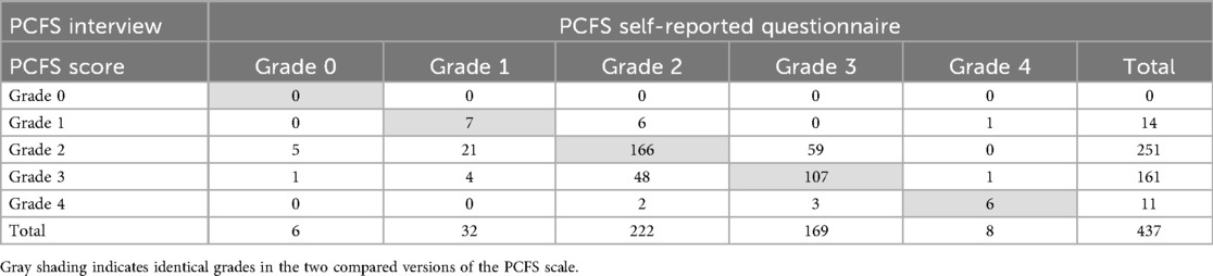 Table 3. Comparison of the interview-based and the questionnaire-based version of the PCFS scale, n = 437.