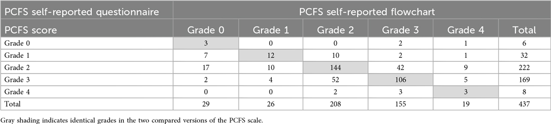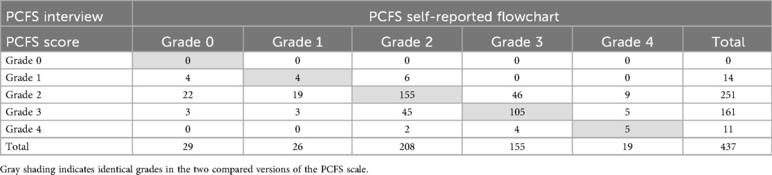 The questionnaire-based version and the flowchart-based version of the PCFS scale differed statistically significantly (p < 0.001). Of the 437 included patients, 268, 61% (57;66) reported the same grade using both administration methods (Table 5).