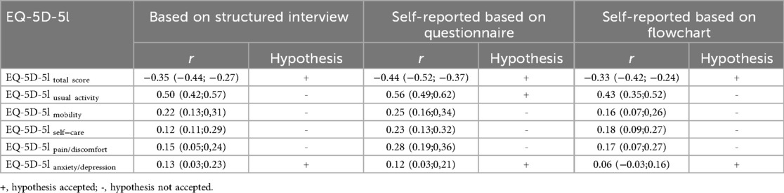 The secondary hypotheses were based on the assumptions that the EQ-5D-5l domain “usual activities” measures a similar construct, the total score and the domains “mobility”, 'self-care', and “pain/discomfort” a related but dissimilar construct, and the domain “anxiety/depression” an unrelated construct.