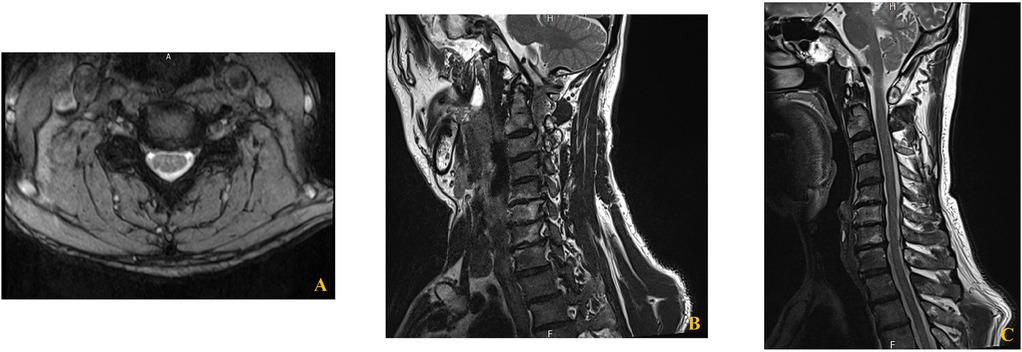 Figure 1. Cervical spine MRI demonstrating right sided foraminal stenosis from C5 to T1. (A) Axial view showing cervical spinal canal and neural foraminal anatomy. (B) Right oblique view with visible cervical vertebrae (C4–C7) demonstrating right-sided foraminal stenosis. (C) Sagittal view showing the cervical spine alignment and neural foraminal narrowing.