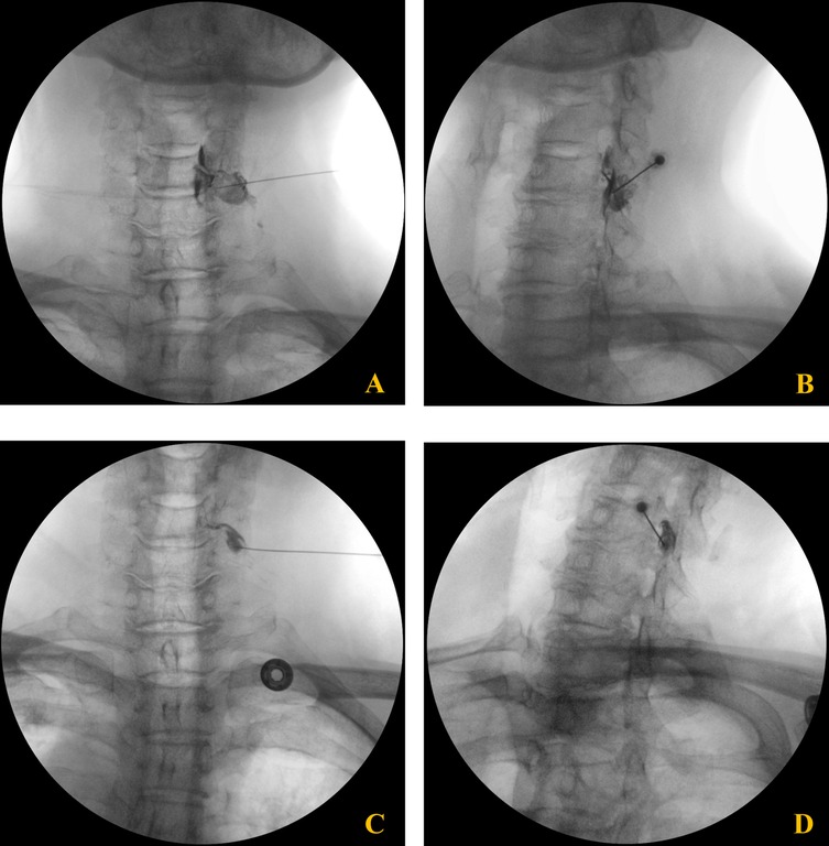 Figure 2. Fluoroscopic images of C6 cervical transforaminal epidural steroid injection. (A,B) Anteroposterior (A) and oblique (B) views of the second injection showing needle placement and contrast spread at the C6 neural foramen. (C,D) Anteroposterior (C) and oblique (D) views of the third injection demonstrating proper needle positioning and contrast distribution along the C6 nerve root pathway.