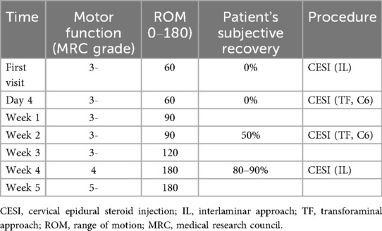 After the first interlaminar injection, no significant improvement in motor function was observed at the 4-day follow-up. Following the first transforaminal injection, the patient reported approximately 50% improvement in motor strength and restoration of shoulder ROM to 90 degrees at the 2-week visit. A second transforaminal injection was administered at this time. By the 4-week follow-up, shoulder ROM had recovered to 180 degrees, and motor function improved to nearly normal, with only mild residual weakness. A final interlaminar injection was performed, and at the 5-week assessment, the patient's motor strength reached MRC grade 5-, with full functional recovery and no limitations in daily activities. Mild fatigue in the right arm was noted during strenuous activity, but there were no adverse effects related to the procedures.