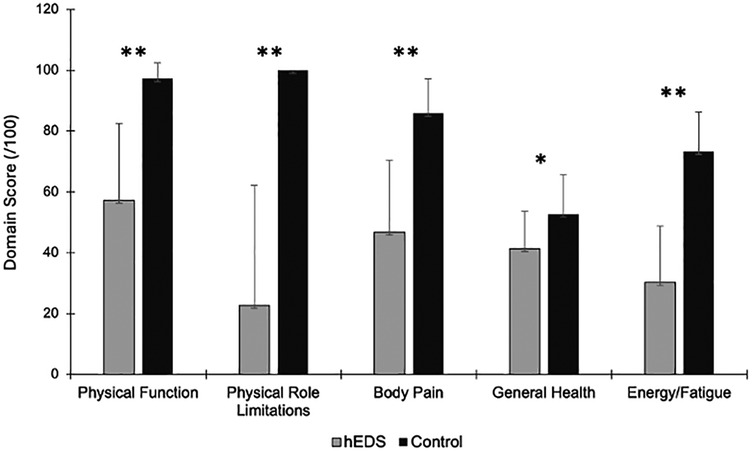Participant characteristics are shown in Table 1. In all SF-36 domains, HSD/hEDS were significantly worse than CON (p < 0.001, Figure 1).