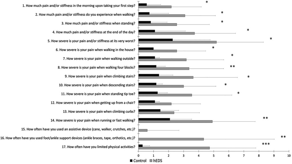 Figure 3 shows self-reported, foot-specific pain and disability, assessed by the FFI. Higher scores on the FFI indicate greater pain and disability. HSD/hEDS reported significantly higher pain (p < 0.05) in most aspects of the FFI.