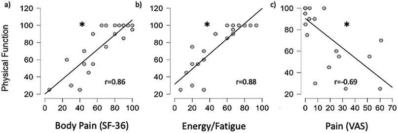 Figure 5. Relationship between physical function vs. body pain (a), energy/fatigue (b) and VAS after PWS walking (c) for all participants. *significant relationship (p < 0.05).