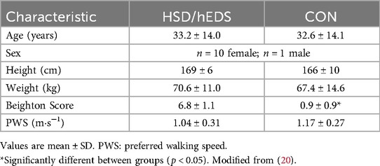 Individuals with HSD/hEDS were recruited from a tertiary physiatry clinic focused on the musculoskeletal consequences of HSD/hEDS. Participants were included if they were previously diagnosed with hEDS (n = 10) or met the criteria for generalized joint HSD (G-HSD) (n = 1) (21). Additional inclusion criteria included participants being able to walk unassisted for at least 30 min and not have a history of smoking or be taking medication that prevented them from being able to complete the walking trial or had a positive response to the Physical Activity Readiness Questionnaire (22). The data presented here represents a secondary analysis of the subjective, quality of life, foot function and fatigue severity data collected during the course of a previously-published study from our lab (20), the purpose of which was to determine how muscle and tendon mechanics contribute to a higher metabolic cost of walking in HSD/hEDS.