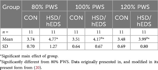 As described previously by Sheehan et al. (20) and shown in Table 2, CoT was significantly higher in HSD/hEDS compared to CON at all speeds (p = 0.034). CoT was significantly higher at 80% PWS compared to both 100% and 120% PWS in HSD/hEDS (p < 0.034) whereas CoT was similar across speeds in CON (p > 0.99).