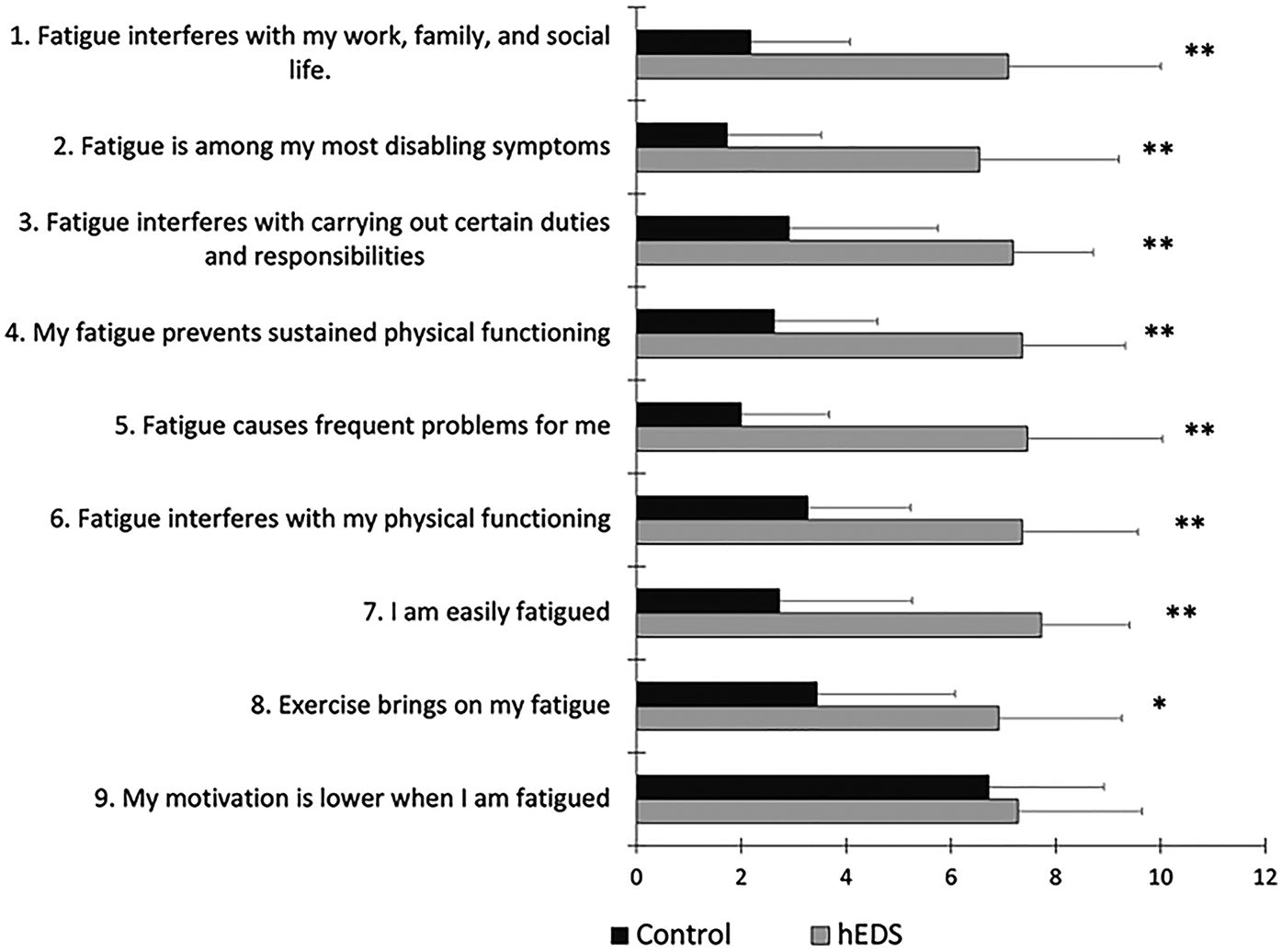 Mean ± SD FSS for HSD/hEDS (grey) and CON (black). *indicate significant group differences (p < 0.01), **indicate significant group differences (p < 0.001).