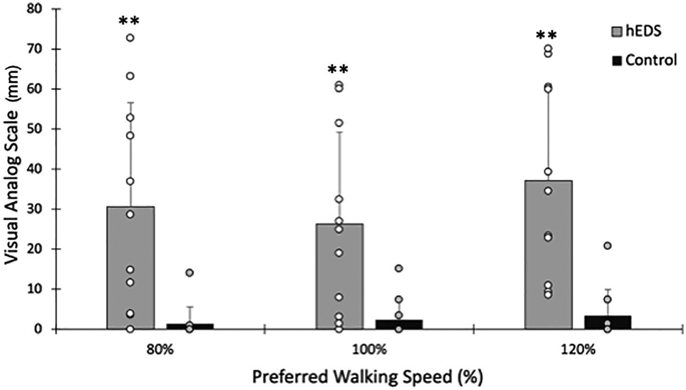 The present study also expands upon the findings of others, showing that this self-reported higher physical impairment, and greater fatigue further present during exercise. We show that despite allowing hEDS participants to choose their preferred walking speed, this speed was not significantly slower than the preferred walking speed of individuals without hEDS. Interestingly, hEDS participants did not choose a slower PWS in order to reduce their self-reported pain of walking. Indeed, even at walking speeds 20% slower than their preferred lower leg pain/fatigue was not different than the lower leg pain/fatigue reported at higher walking speeds. This pain was also substantial (30/100) and significantly higher than the lower leg pain/fatigue in individuals without hEDS. Together, these results demonstrate the importance of considering joint hypermobility in even the most preferred intensities of exercise for these individuals.