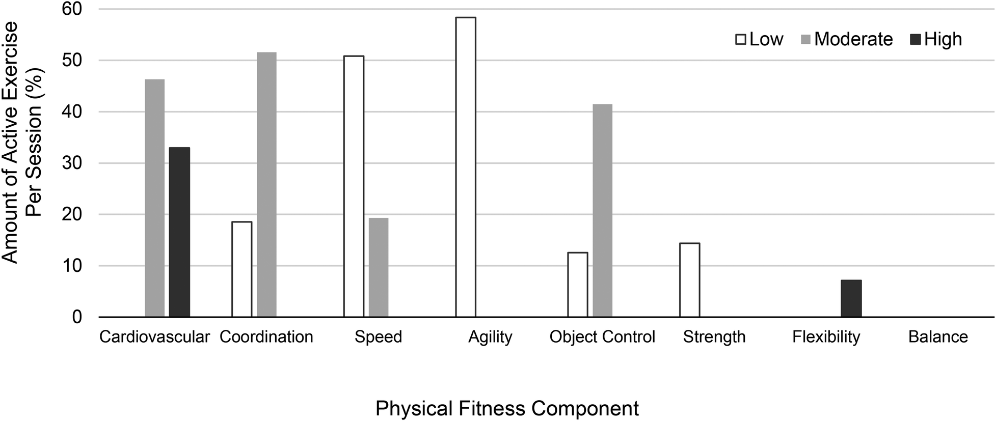 Figure 4. Median amounts of physical fitness components per exercise session (where low = present for ∼1%–24% of exercise duration, moderate = present for ∼25%–74% of the exercise, high = present for ≥75% of the exercise). Cardiovascular content was the leading physical fitness component present in high amounts (black). Coordination was the leading physical fitness component present in moderate amounts (gray), followed closely by cardiovascular and object control content. Agility content was the leading physical fitness component present in low amounts (white), followed closely by speed.