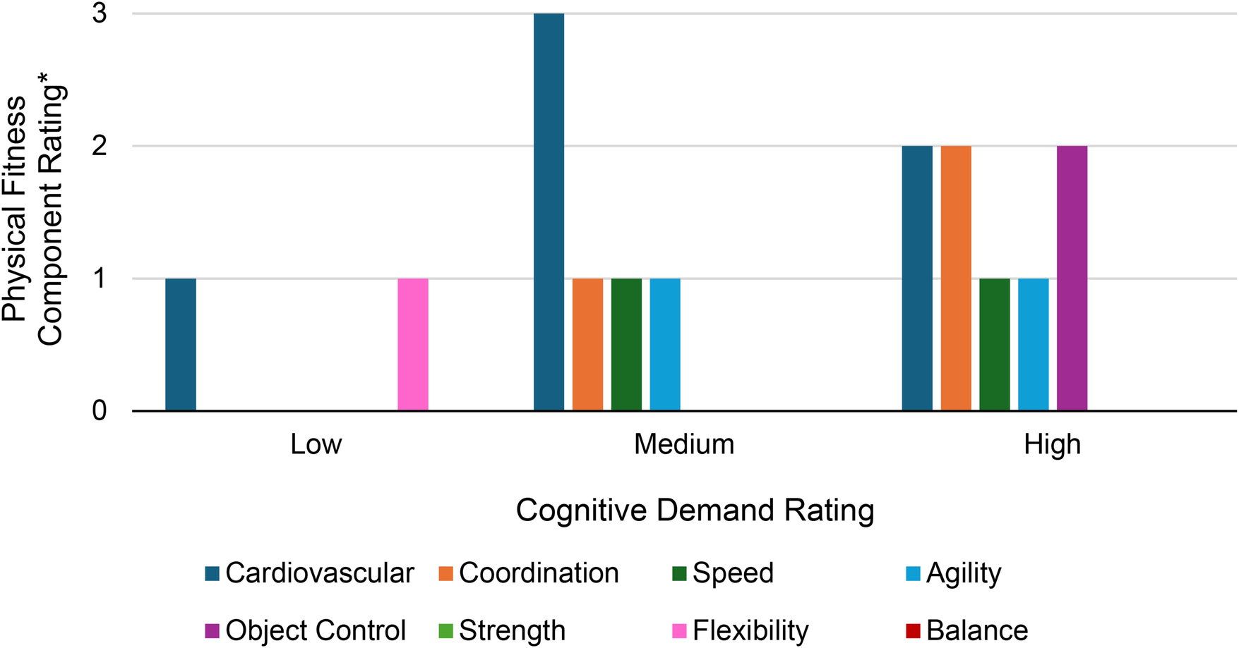 Figure 5. Median physical fitness component rating by cognitive demand rating. The amount of cardiovascular (blue) content varied across the different levels of cognitive demand. Medium cognitive demand exercises contained the highest amount of cardiovascular content. While the amount of speed (forest green), and agility (light blue) content remained the same between medium and high cognitive demand exercises, the amount of cardiovascular content decreased from medium to high cognitive demand and the amount of coordination (orange) and object control (magenta) content increased (Other physical fitness component colors: flexibility = pink; strength = light green; balance = red). *Physical fitness component rating: 1 = low, 2 = moderate, 3 = high.
