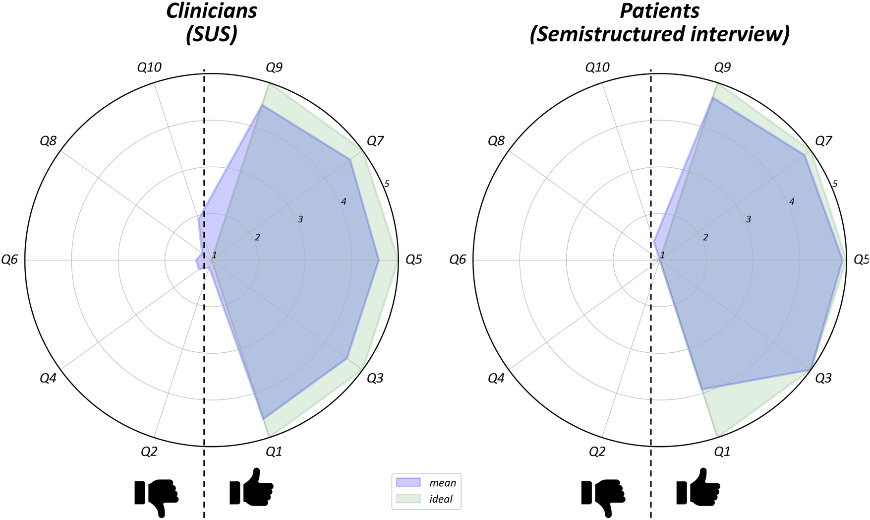 Item-by-item results of clinicians SUS questionnaire and patients semi-structured interview. They bothconsisted of ten items with response options on a 5-point Likert scale. For each radar plot items with positive (on the right) are split from those with negative (on the left) meaning. The green area indicates the hypothetical maximal appreciation of the device, while the blue area the mean of users judgments.
