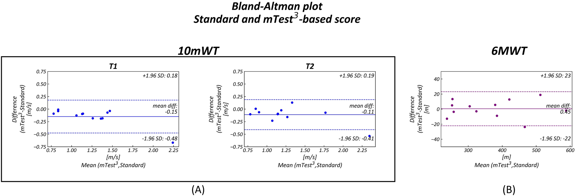 Bland–Altman Plots comparing standard and device-based (mTest3) measurements. Each plot shows on the y-axis the difference between the standard and the mTEST3 measurements and on the x-axis the mean of them. The limits of agreement are represented as dotted lines (±1.96 SD) while mean differences are displayed as continuous lines. In all three Bland–Altman plots the distributions fall inside the limits of agreement. (A) 10 MWT first (T1) and second (T2) trial (B) 6 MWT.
