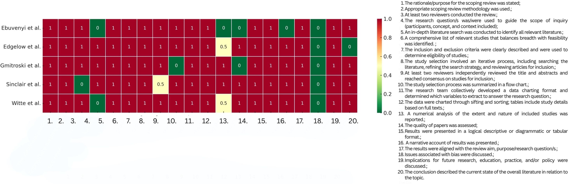 ChatGPT version 5 was used, given a single prompt, to generate a heatmap for illustrating the scoping review quality assessment results, after providing the input data in editable table format [following the criteria from The Scoping review Checklist; (19)]. On one hand, using AI-generated figures for data visualisation support, such as a heatmap for the quality appraisal of reviews in our article, brings a high-quality illustration in an efficient way. AI-generated figures represent an efficient, accessible, high-quality method for visual representations in an academic article. On the other hand, the AI-generated images could incorporate incorrect or fabricated details, therefore researchers should thoroughly verify the AI-generated figures and compare them with the raw data from their research. For a detailed discussion regarding the risks of AI usage for generating figures, see Skulmowski and Engel-Hermann (20). The raw date used in this case is openly provided in Supplementary Material 3.