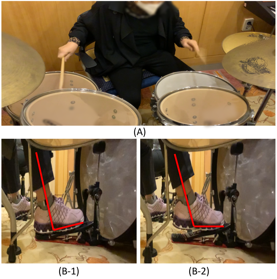 Examples of drum set playing used in the intervention. (A) Example of upper limb playing. (B-1) Example of lower limb playing using the heel-down position. (B-2) Example of lower limb playing using the heel-up position.