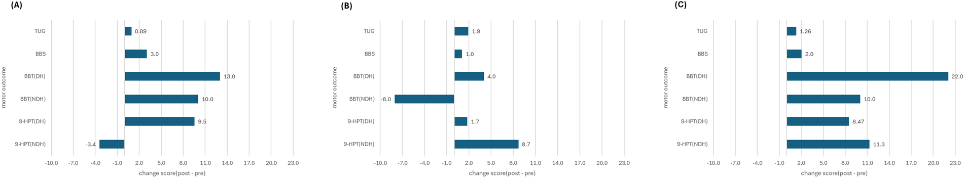 To assess changes in participants' motor control following the intervention, assessments of balance (TUG, BBS), upper limb function (BBT, 9-HPT), upper limb control (MIDI-drum tapping task), and cognitive function (TMT, K-CWST) were conducted. The pre- and post-test results for each participant are presented below (refer to TableĀ 3 and FigureĀ 4).