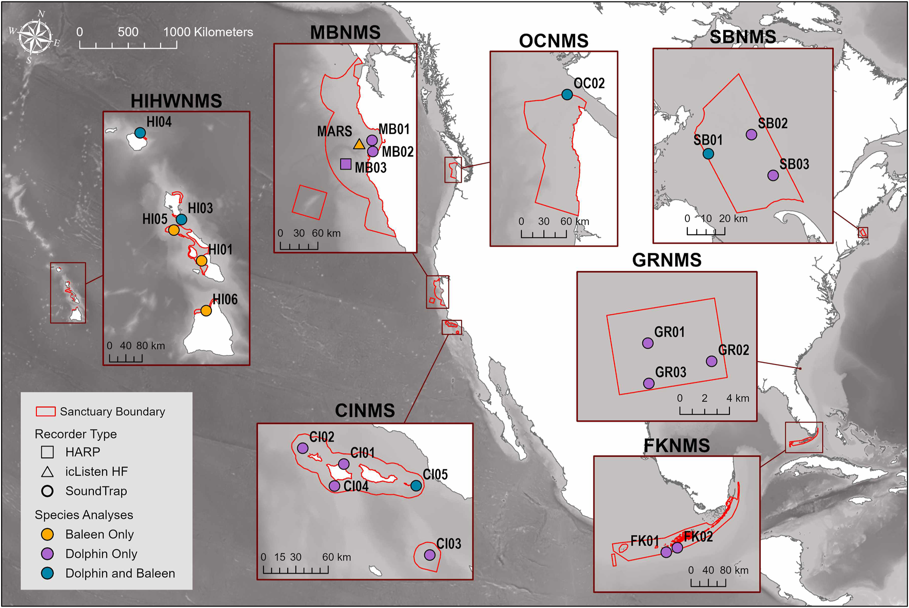 In 2018, a 3 year large scale acoustic monitoring program, the National Oceanographic and Atmospheric Agency (NOAA)/Navy’s SanctSound project1, was created to monitor long term biological, anthropogenic, and abiotic contributors to soundscapes throughout the NMS network2. As part of this project, a total of 34 bottom-mounted passive acoustic recorders were stationed across seven NMS and one national monument, divided into three main regions: East Coast Region United States (US) - Stellwagen Bank National Marine Sanctuary (SBNMS), Gray’s Reef National Marine Sanctuary (GRNMS), Florida Keys National Marine Sanctuary (FKNMS); West Coast Region US - Olympic Coast National Marine Sanctuary (OCNMS), Monterey Bay National Marine Sanctuary (MBNMS), Channel Islands National Marine Sanctuary (CINMS) and Hawaiʻi Region US - Hawaiian Islands Humpback Whale National Marine Sanctuary (HIHWNMS), and the Papahānaumokuākea Marine National Monument (PMNM). In general, acoustic recorders were deployed at three to six recording sites within each NMS and recorded continuously between three to 5 months.