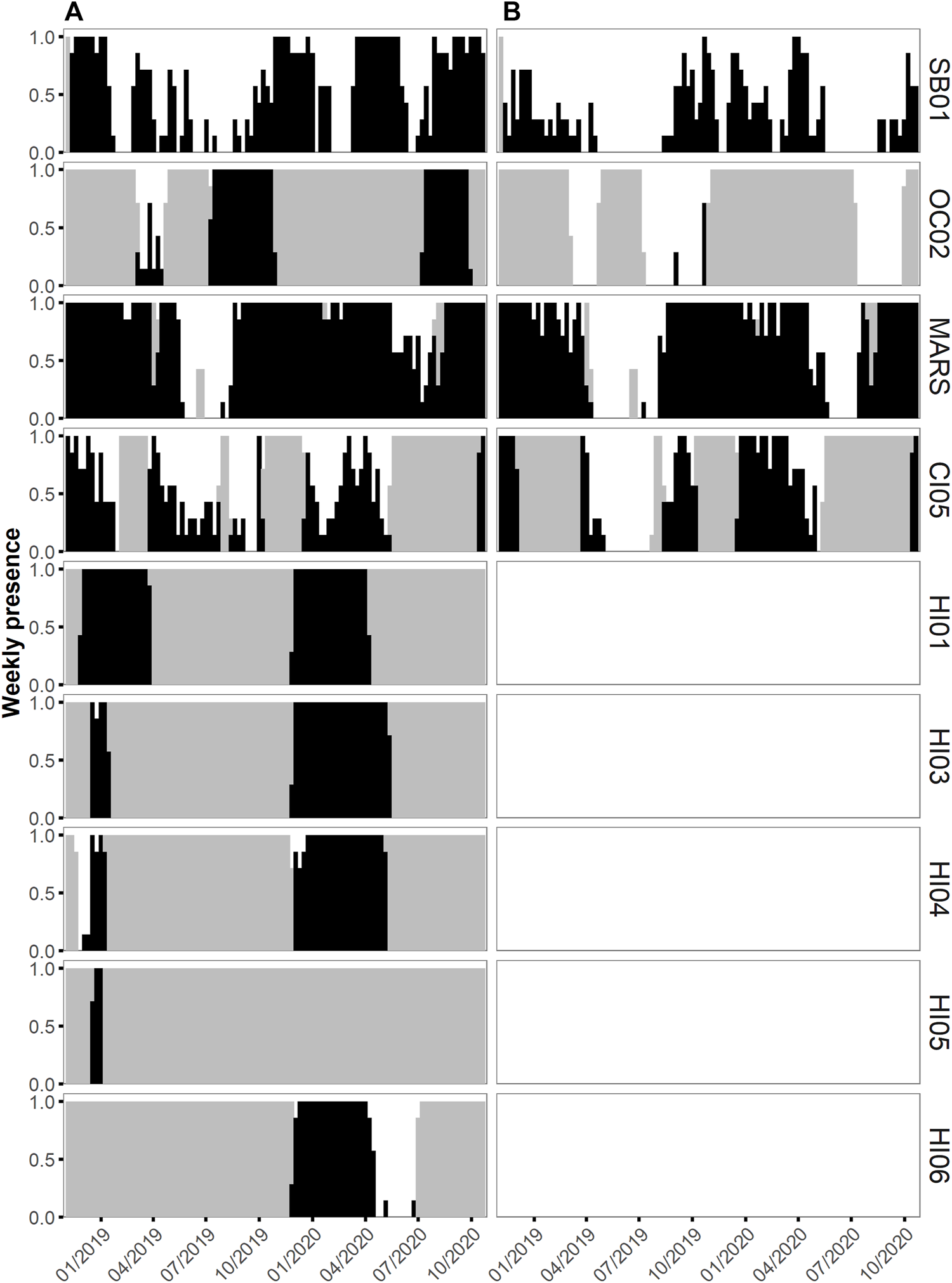 Weekly acoustic presence between 1 November 2018 to 31 October 2020 of humpback whale vocalizations (A) and fin whale 20 Hz pulses (B) as a ratio from 0 to 1 per chosen recording site within each National Marine Sanctuary within the East Coast US region (Stellwagen Bank NMS, site SB01), the West Coast US region (Olympic Coast NMS, site OC02; Monterey Bay NMS, site MARS; Channel Islands NMS, site CI05) and the Hawaiʻi US region (Hawaiian Islands Humpback Whale NMS, sites HI01, HI03, HI04, HI05 and HI06). Presence is denoted by black bars and days without data by grey bars. Fin whales were not analyzed at the Hawaiian sites.