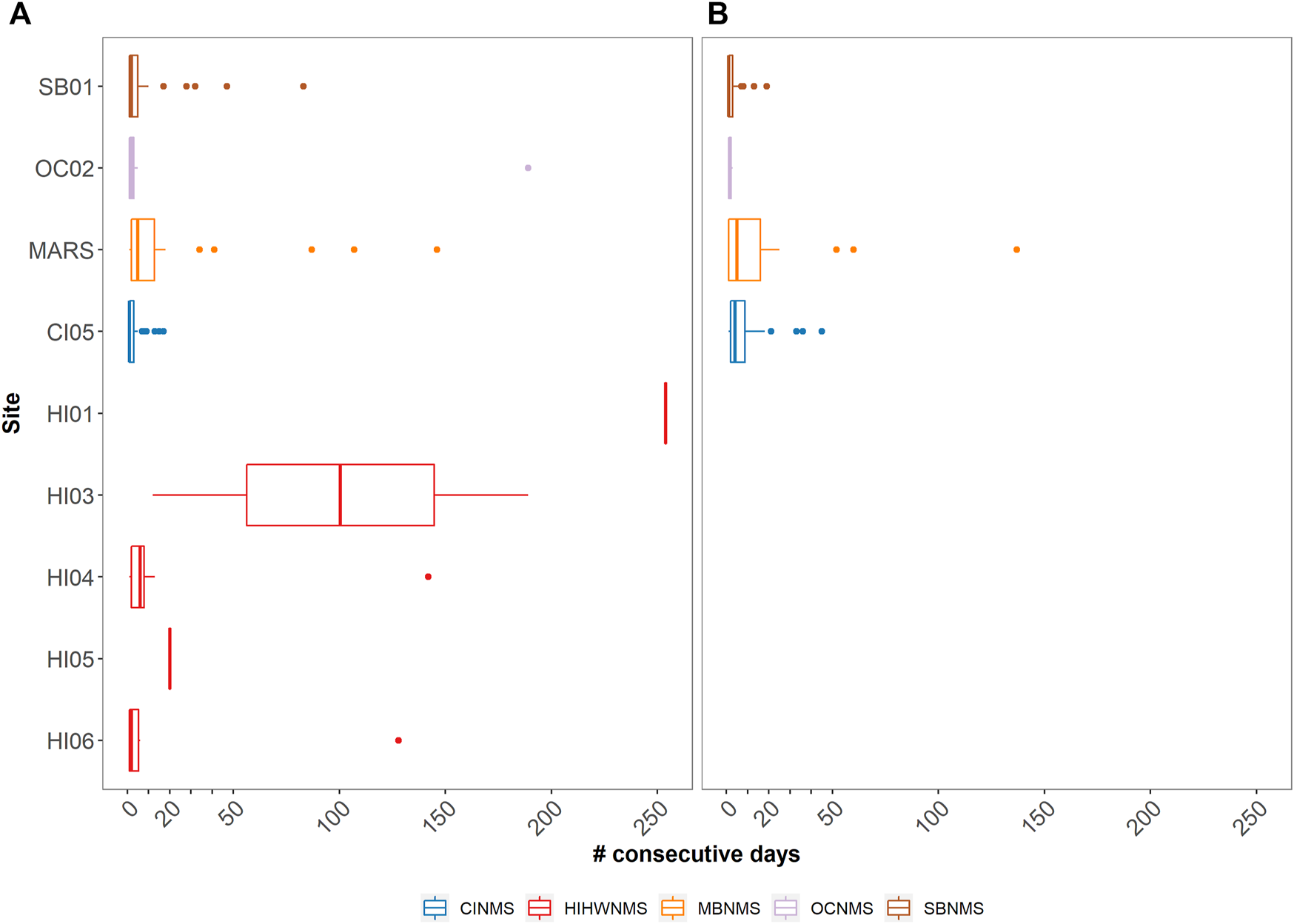 Boxplots showing the median and quartile values of acoustic presence as the number of consecutive days they were detected in each of the five sanctuaries analyzed (Stellwagen Bank NMS [SBNMS] = SB01, Olympic Coast NMS [OCNMS] = OC02, Monterey Bay NMS [MBNMS] = MARS, Channel Islands NMS [CINMS] = CI05, Hawaiian Islands Humpback Whale NMS [HIHWNMS] = HI01, HI03, HI04, HI05, HI06) for humpback (A) and fin whale (B) species.