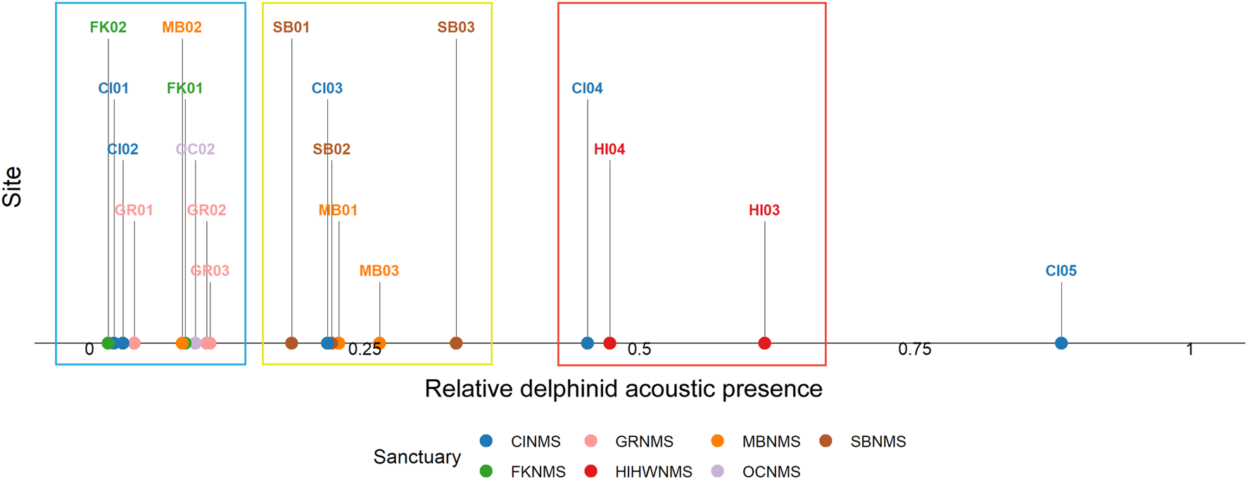 The ratio of hourly delphinid whistle presence normalized by recording effort (0–1) from 1 June 2019 to 31 May 2020 at each passive acoustic recording site across seven NMS, divided into three main regions: East Coast Region United States (US)—Stellwagen Bank National Marine Sanctuary (SBNMS), Gray’s Reef National Marine Sanctuary (GRNMS), Florida Keys National Marine Sanctuary (FKNMS); West Coast Region US - Olympic Coast National Marine Sanctuary (OCNMS), Monterey Bay National Marine Sanctuary (MBNMS), Channel Islands National Marine Sanctuary (CINMS) and Hawaiʻi Region US - Hawaiian Islands Humpback Whale National Marine Sanctuary (HIHWNMS). The sites with low ratios of delphinid acoustic presence are highlighted within the blue box, medium ratios within a yellow box, and high ratios in a red box. CI05 was an outlier compared to the other sites with a very high ratio of delphinid acoustic presence.