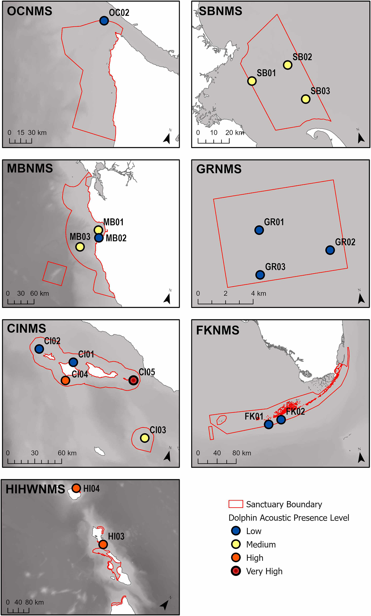A map of the relative percent delphinid acoustic presence classified into four levels (low, medium, high, very high), for each recording site within each sanctuary. The sanctuaries represented are the Hawaiian Islands Humpback Whale National Marine Sanctuary (HIHWNMS), Olympic Coast National Marine Sanctuary (OCNMS), Monterey Bay National Marine Sanctuary (MBNMS), Channel Islands National Marine Sanctuary (CINMS), Stellwagen Bank National Marine Sanctuary (SBNMS), Gray’s Reef National Marine Sanctuary (GRNMS), and the Florida Keys National Marine Sanctuary (FKNMS), and are outlined in red.